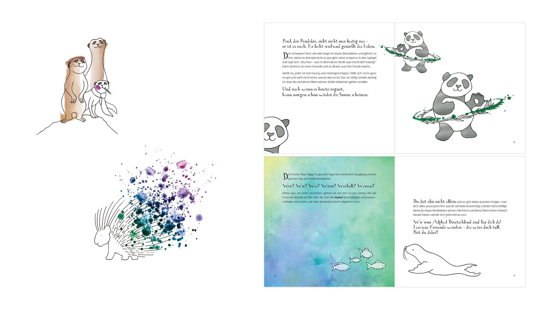 Wer meint, es ist leicht „nur“ für Kinder zu schreiben, der irrt. Verknappte Texte erfordern größte Sorgfalt und Kompetenz. Die Texterin Ute Battig hat als Nichtbetroffene die ersten wichtigen Sachinformationen formuliert. Hierbei unternimmt die Robbe Ralph, die gleichzeitig das Logo für Alpha1 Kinder ist, einen Streifzug durch die vielfältige Tierwelt. Das halte ich für äußerst Identität stiftend und absolut gelungen.