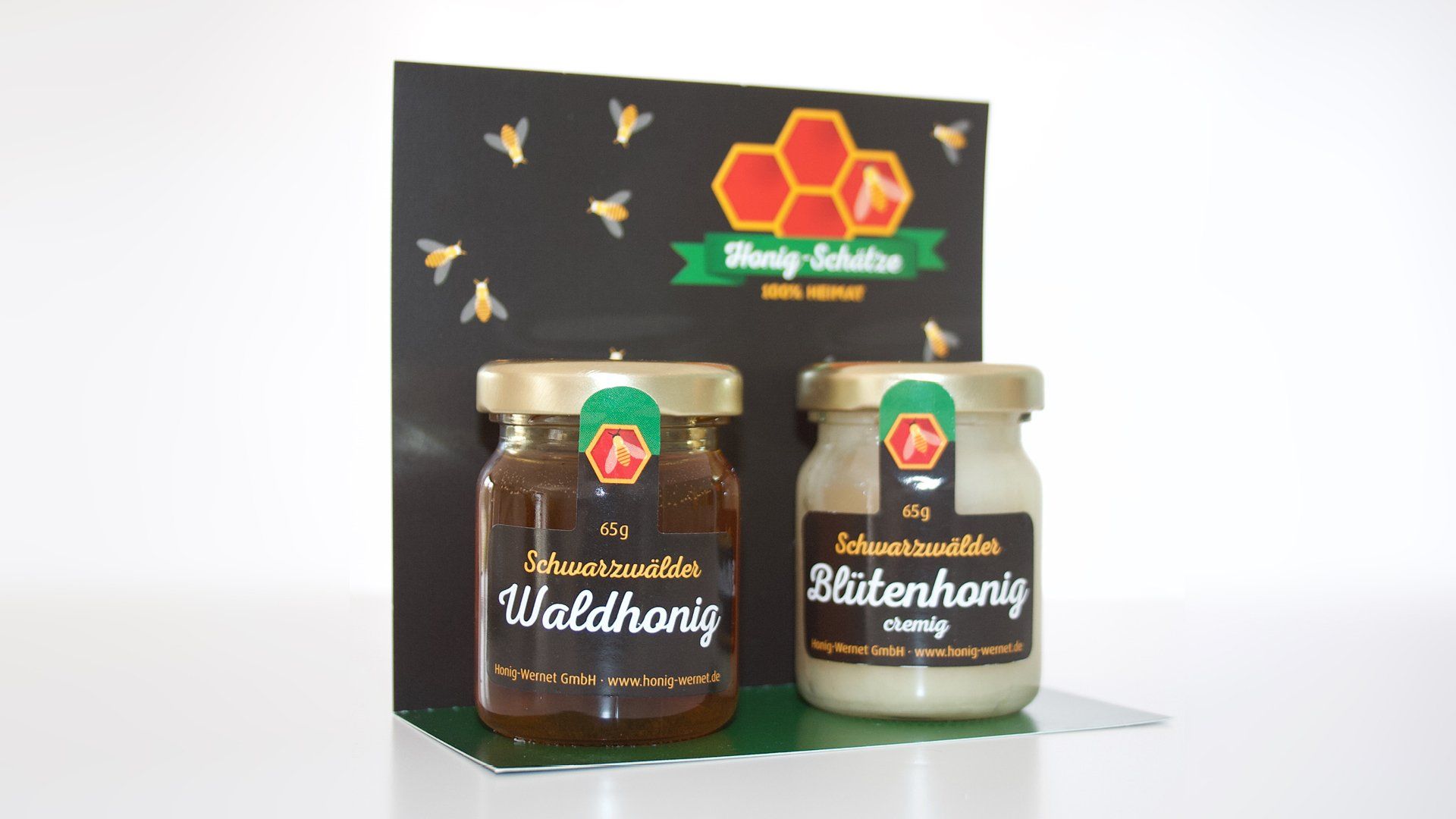 - Die natürliche Ressource „Honig“ wird zum edlen Gut. Herausarbeiten des Produktnamens „Honig-Schätze“ in Anlehnung an den Unternehmensnamen Honig-Wernet.